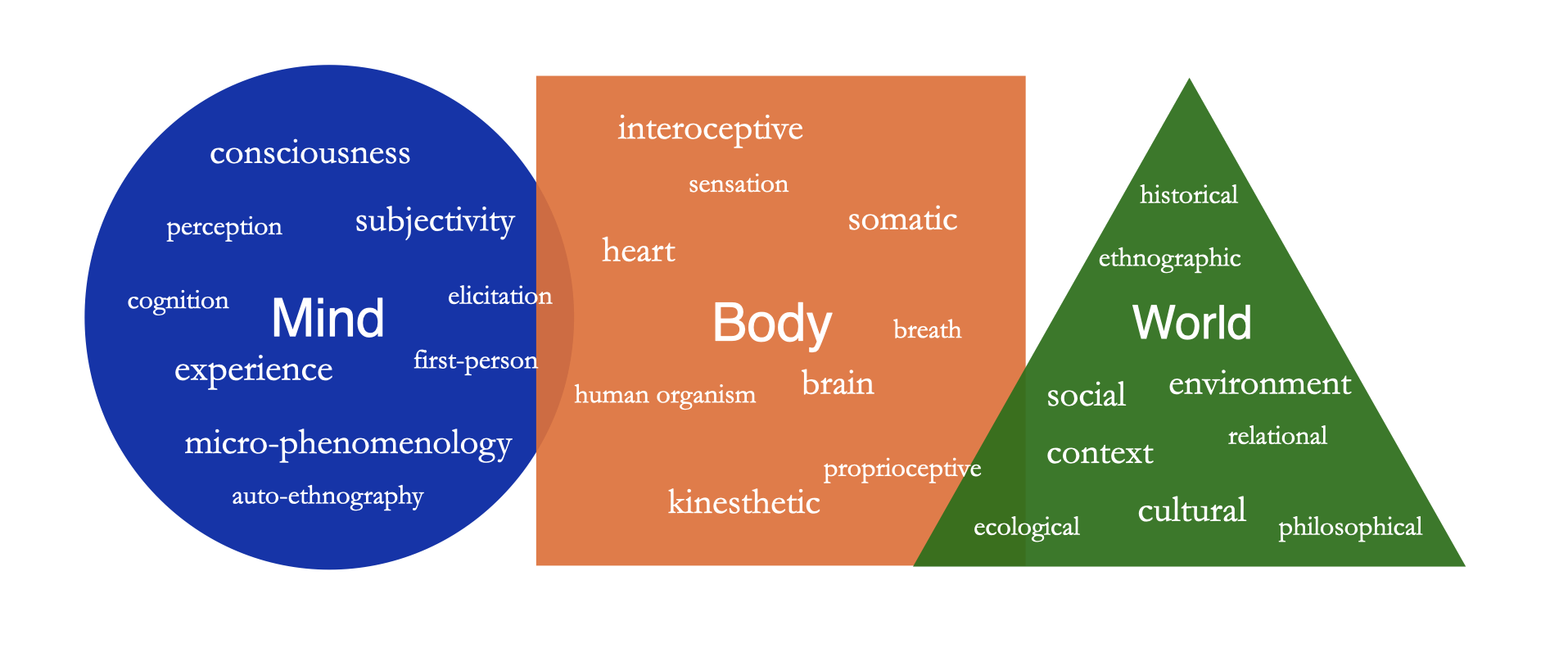 | Mind | 1st- and 2nd-person methods: micro-phenomenology, questionnaires, autoethnography, visual elicitation, other qualitative measures |